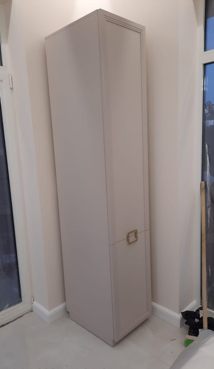 - За фасадом верхней секции — полка ЛДСП и штанга для одежды;