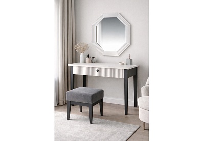 Комплект состоит из трехстворчатого шкафа, кровати с мягким изголовьем, двух небольших тумб и стола с пятью выдвижными ящиками, который с легкостью заменит привычный туалетный столик. Высокие скошенные опоры из массива бука облегчат уборку, а настенное зеркало и зеркальная вставка системы хранения помогут в процессе сборов. Корпусная часть меблировки изготовлена из ЛДСП, а фасады — из МДФ, окутанной ПВХ-пленкой оттенка «белый премиум». Модульность гарнитура предполагает возможность выбора мебельных изделий по размерам и функционалу.